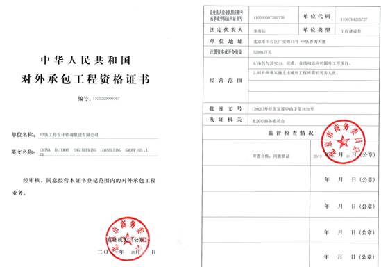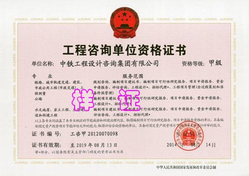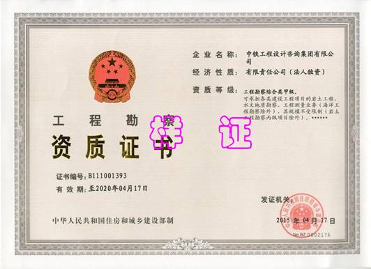 Grade A qualifications cover the following field: geotechnical investigation and surveying, engineering design,engineering consultancy, engineering construction costing, surveying and mapping, construction supervision, and geological hazard control works (investigation, design, supervision), geological hazard risk assessment etc. Grade B qualifications for environmental impact assessment, Grade C qualifications for soil and water conservation scheme;CEC was appointed by Beijing Municipal Commission of Urban Planning to review design documents on rail transit works and related works in urban infrastructure, and was appointed by the Ministry of Housing and Urban-Rural Development to test and examine construction quality;With China metrology accreditation certificates issued by the supervision and administration commission of the country.CEC holds metrological certificate issued by competent authority, business license for overseas project, is one of the designated survey and design institutes for foreign aid projects, and one of the consultants in foreign aid projects economic and technical service network. It is qualified for geotechnical investigation and surveying, consultancy, design, construction supervision, and supply of labor force, equipment and materials, and foreign economic cooperation for overseas projects and foreign-funded projects in China.