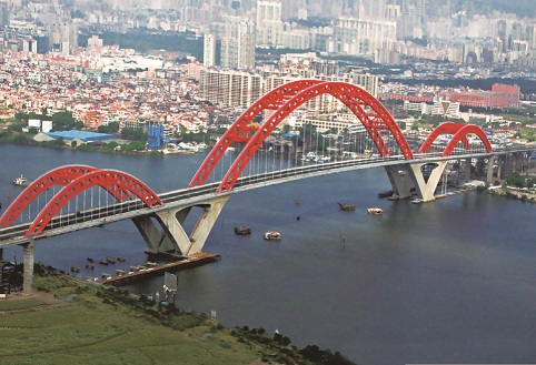 廣州市新光大橋——珠江景觀長廊上的新地標,它恰似一只騰飛而起的大雁,又如一道彩虹飛架在珠江上。新光大橋全長1083米,大橋跨越珠江主航道,主墩基礎位于水中,地質條件復雜,水深受潮汐影響顯著。主橋采用177m+428m+177m三跨連續鋼桁拱與混凝土三角剛構的新型組合結構,工程技術難度極大,施工風險極高。徐升橋帶領技術團隊對此種新型橋梁結構的受力原理、關鍵構造以及施工新方法、新工藝等進行了成套技術攻關,經過3年的研究和工程實踐,取得了諸多創新性成果:設計出世界上首座三跨連續鋼桁拱橋與混凝土三角剛構的新型組合橋;提出了“原位臥拼+垂直提升”和“三大段浮運提升”施工方案;找到了利用小型機具實現拱橋大節段安裝的新方法,并評為國家級工法(GJYJGF067-2008),大橋合龍時,這座“巨無霸”的主拱軸線偏差僅為兩個毫米;提出了大型深水基礎不封底單層鋼板樁圍堰施工新工藝,獲得了國家發明專利;降低了施工成本,大橋的鋼結構用量只有18t/m,大大低于同等跨度橋梁,節省鋼材3500噸,采用不封底鋼板樁圍堰技術節省了混凝土8000立方米,節省造價共4600萬元;在不完全斷航情況下僅2天時間便實現了主拱拱肋中段的安裝架設工作,并創造了剛構拱組合跨度、拱肋滑移上船、提升以及拱肋曲梁合龍工藝等世界紀錄。相關發明專利在多座大橋建設中得到成功應用,取得良好的社會效益和經濟效益。新光大橋先后獲得2007年廣州市科學技術一等獎、2007年中國鐵路工程總公司科學技術特等獎以及2008年中國建設工程魯班獎(國家優質工程獎)、第八屆中國土木工程詹天佑獎等榮譽。