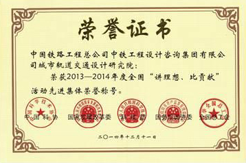 日前,在中國科學技術協會、中華人民共和國發展和改革委員會、中華人民共和國科學技術部、國務院國有資產監督管理委員會和中華全國總工會共同組織的“講理想、比貢獻”活動評比中,中國鐵路工程總公司中鐵工程設計咨詢集團有限公司城市軌道交通設計研究院榮獲2013-2014年度全國“講理想、比貢獻”活動先進集體,并獲得了榮譽證書和獎牌。