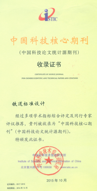 10月21日,中國科學(xué)技術(shù)信息研究所在北京舉辦了“中國科技論文統(tǒng)計結(jié)果發(fā)布會”。會上發(fā)布了“2015中國科技期刊引證報告(核心版)”。中鐵咨詢集團(tuán)主辦的《鐵道標(biāo)準(zhǔn)設(shè)計》期刊被收錄為“中國科技核心期刊”,并被收入中國科技論文與引文數(shù)據(jù)庫(CSTPCD),這是自2006年以來《鐵道標(biāo)準(zhǔn)設(shè)計》期刊連續(xù)10年被中國科技核心期刊收錄。