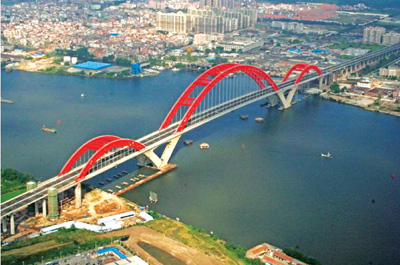 廣州新光大橋是世界上第一座由鋼桁拱與V型剛構(gòu)組合而成的飛雁式三跨中承式拱橋,主橋?yàn)?77+428+177m的三跨連續(xù)剛構(gòu)鋼桁拱橋。主、邊拱拱肋采用五大段提升法施工,其中邊拱為原位拼裝、垂直提升,主拱為碼頭拼裝、滑移上船、浮運(yùn)就位、垂直提升,創(chuàng)造了我國橋梁施工整體提升重量及高度的最高紀(jì)錄(2600t,約96m),在世界橋梁施工中名列前茅。